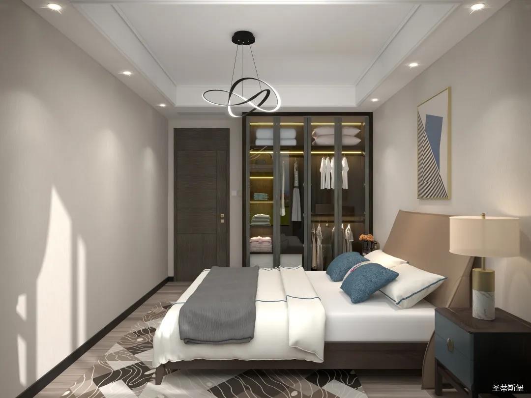 卧室主要的诉求是温馨、舒适、休闲。主卧在设计上将空间整体色彩饱和度降低,大都采用了米白、灰等浅系色调,材质从实木的基础上纳入少量的金属,让家具的整体造型简约精致,同时也为空间的通透感奠基。